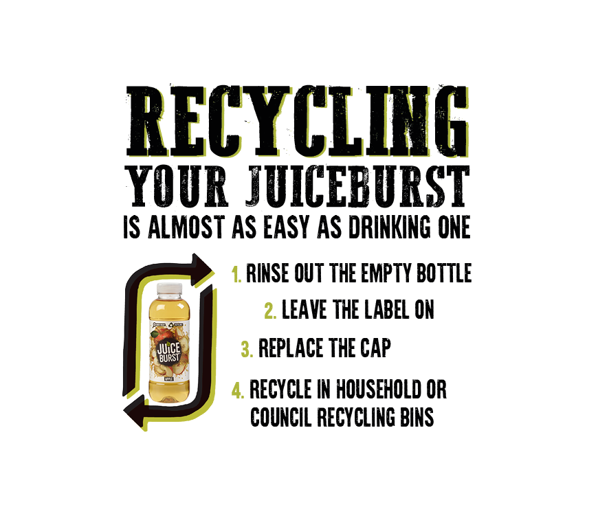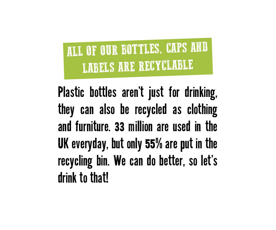 We're eco-friendly: Our planet gives us so much - including the fresh, nourishing fruit for our juices - so it's super important to us to look after the environment in return. We've made sure all our labels, lids and bottles are made from recyclable plastic so that, when you've finished with them, they can be given a new lease of life.